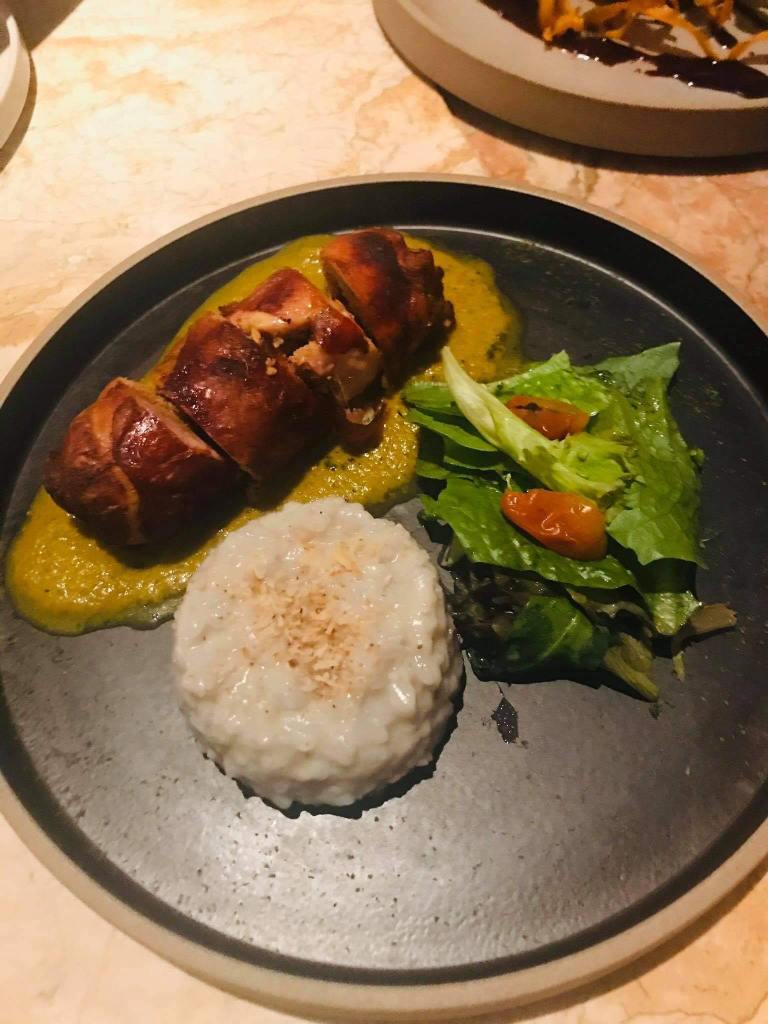 Chicken percik roulade – comprised of chicken chop, kerabu risotto and percik sauce.