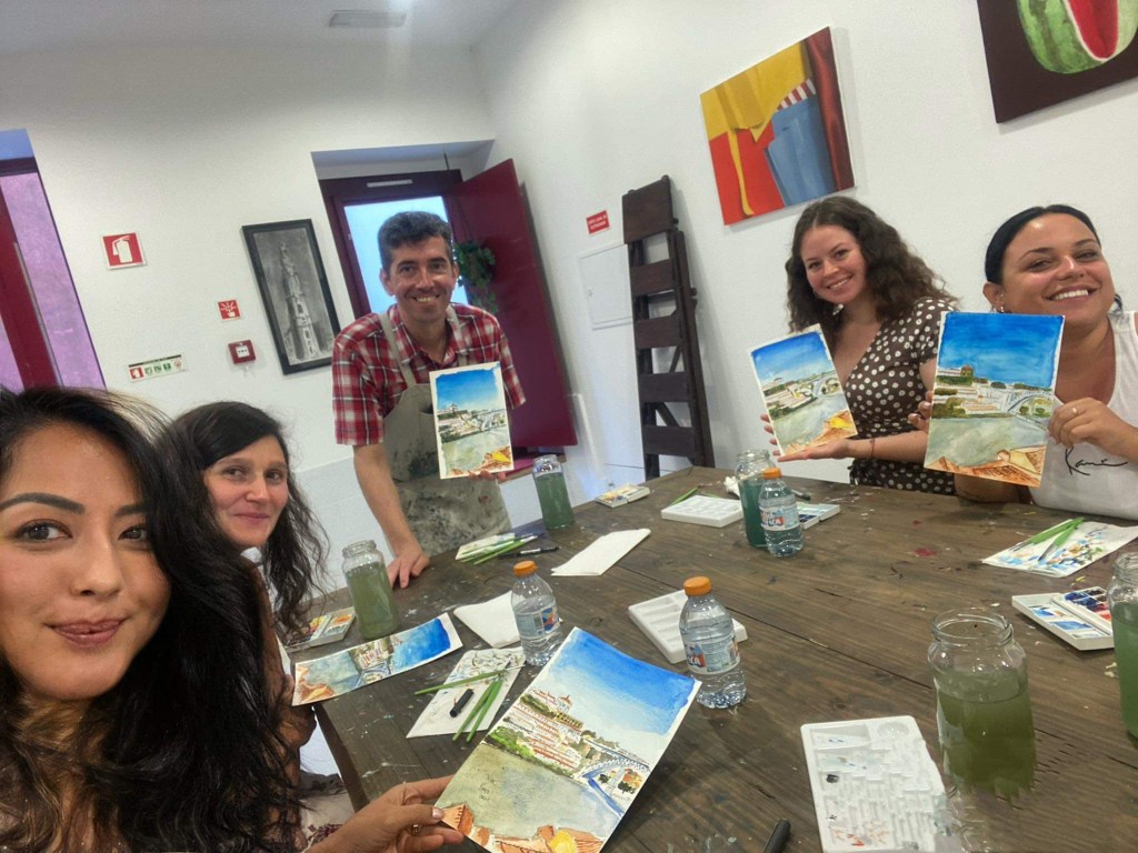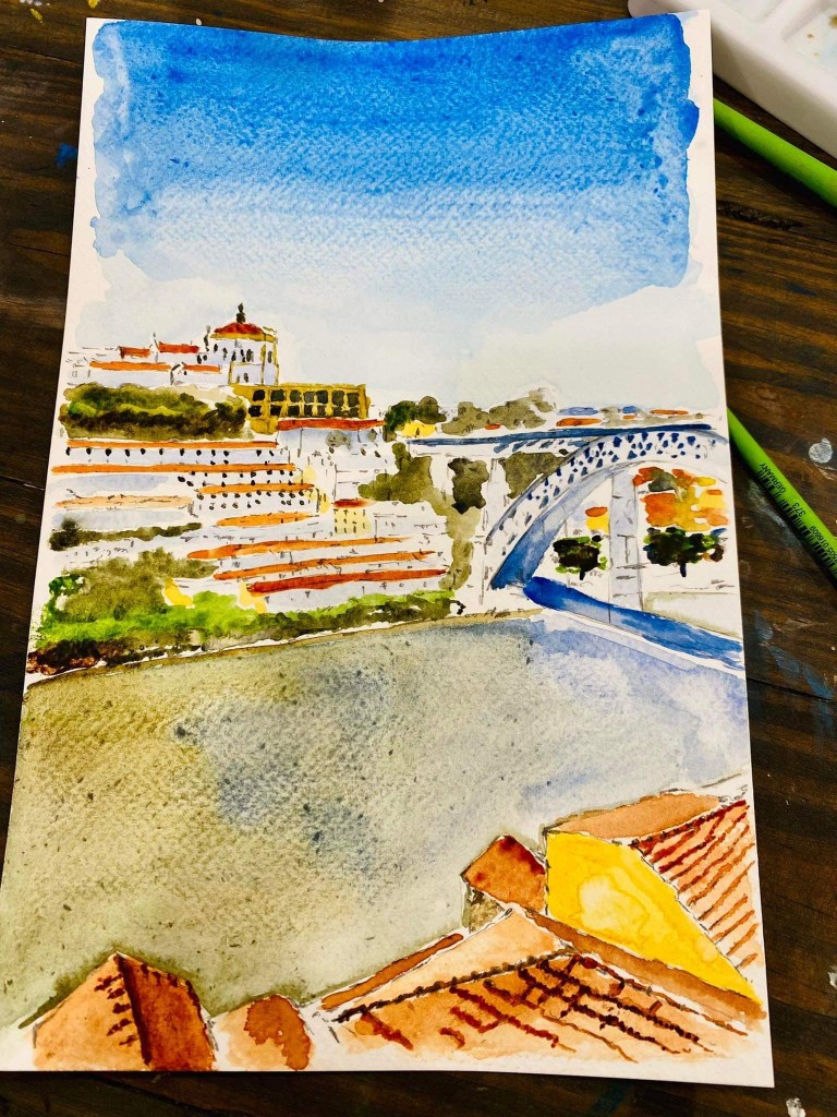 In my last morning, I went for a watercolour class in Porto. I found the street facades in the city so attractive, with the vintage trams coursing through narrow cobbled streets set against the fascinating Romanesque, Gothic type architecture of the properties and I searched online for art classes that would allow me to paint a visual memory of Portugal. Hugo’s class looked the most compatible for me – simple watercolours to preserve a memory of this trip. He had the watercolours, palette and water ready for us, and already pencilled in the outline of the painting – which was an elevated view of Gaia from Porto. I learned a lot of interesting techniques and ideas from the class – mixing colours to enrich the sea and sky, how to paint for ‘noise’ but not necessarily to depict accuracy, and being a bit bolder with the textures. The class is also set in the basement of his lovely Art Gallery, which was situated in a historic part of the city and was selling such delightful paintings of Porto facades and local delights. Hugo was patient, warm, friendly and knowledgeable – I enjoyed listening to his views not just on art but also about the world. For watercolour beginners, this is a joyful way to learn from a local artist. You can check out his classes at this link https://abnb.me/uRFB6LZJBzb
