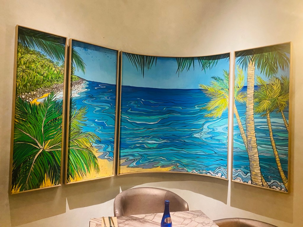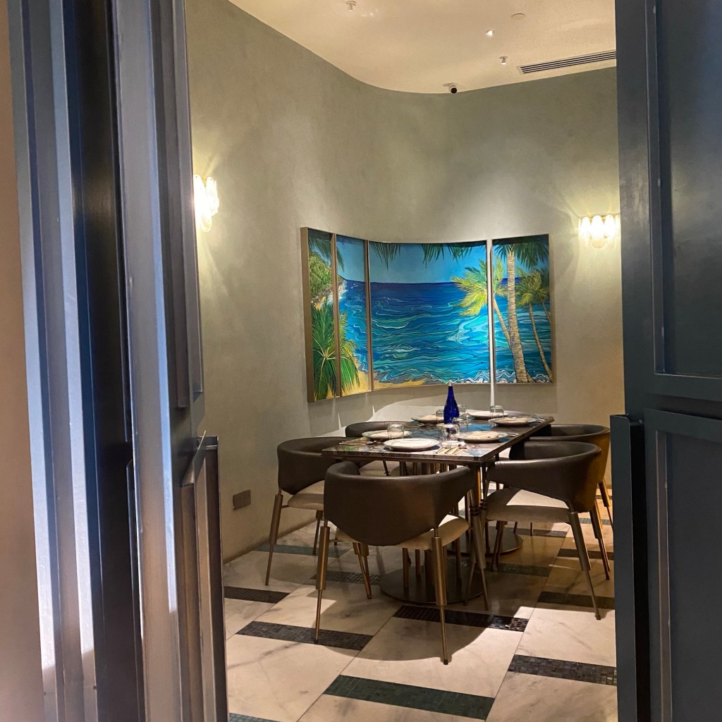 Aesthetically, Coast emanates nautical opulence with stunning art pieces by talented artist Nini Marini (who described her reflections on her art for Coast here) mainly depicting the vibrance of Keralan life, an exquisite palette of teal, aqua and turquoise, glass walls throughout and interspersed with serene water features injecting the space with a calming energy flow. Once you step in, the alluring confidence of Coast’s entire presentation somehow assures you that this will be a whole dining affair, not just a place to eat.